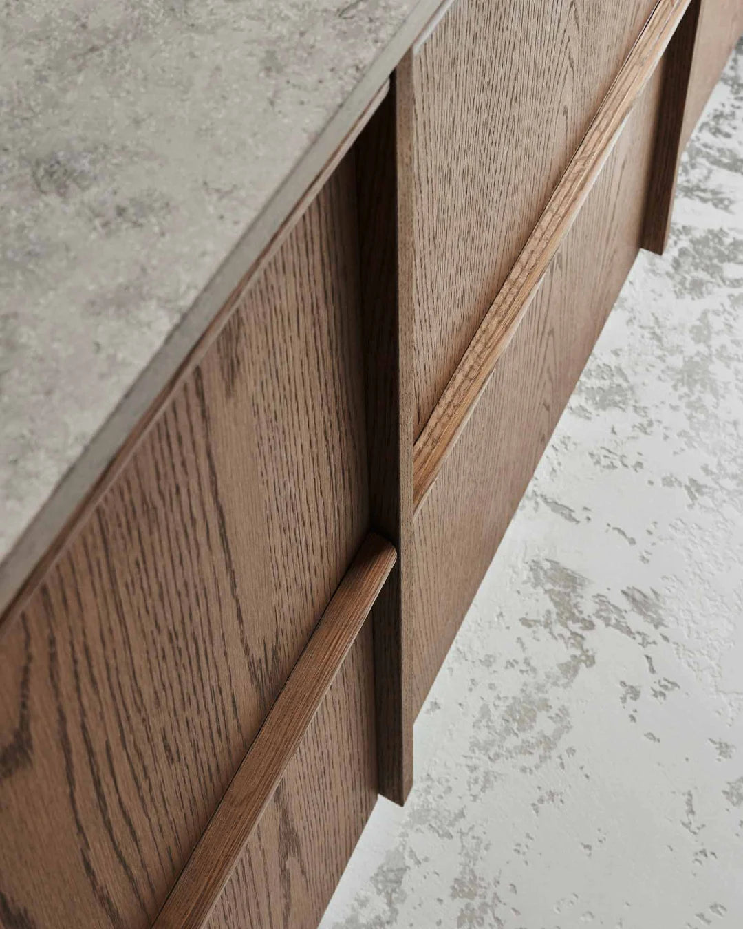 Flat Oak Brown is characterized by its smooth oak veneer in varying widths, which gives a vibrant and harmonious feel. To further enhance the overall impression, the drawer front veneer is pattern-matched so that the oak wood grain follows the height and creates a harmonious flow. The deep brown tone of the door creates a warm feeling and gives the fine structure of the oak life and character.