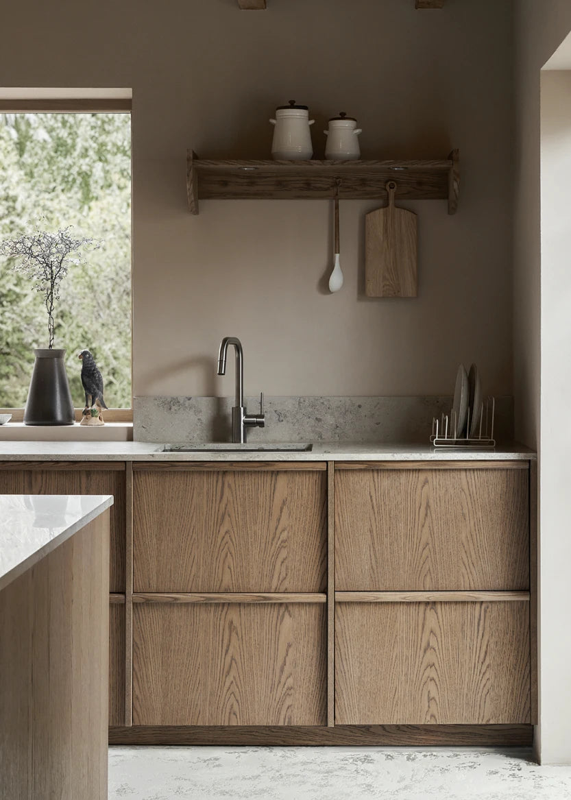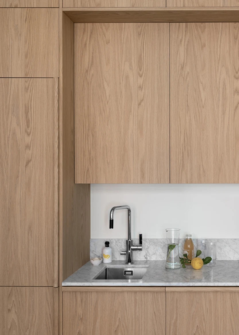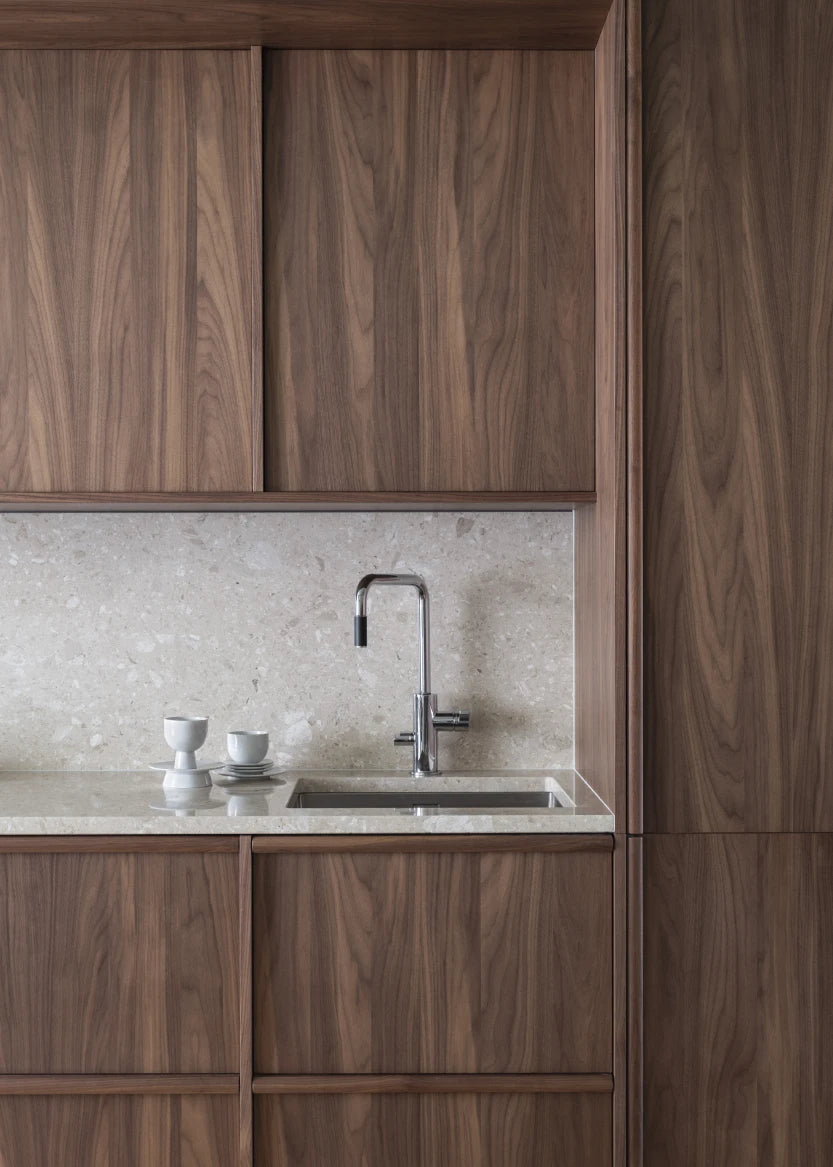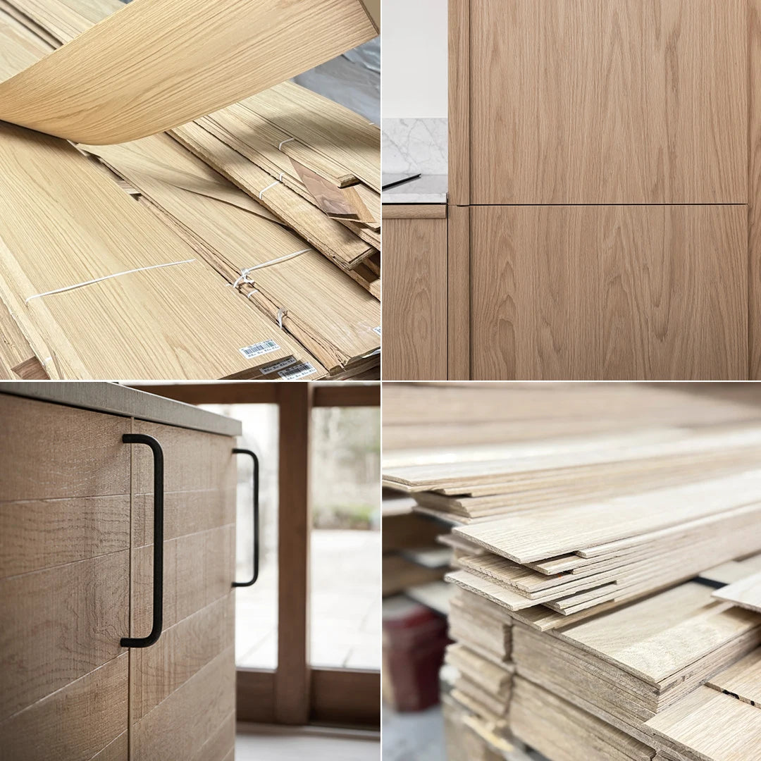 Every detail, from doors and drawer fronts to cover panels and trim pieces, is made to order. We select veneers from the same log to ensure a uniform tone and harmonious expression throughout the kitchen. In addition, the grain of the wood is carefully matched, creating a natural and elegant whole.