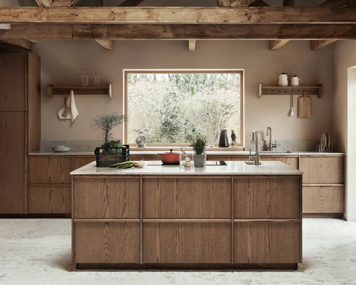 Give your kitchen a natural and timeless look with our tall cabinet door in Flat Oak Brown . It is made with a smooth oak veneer in different widths, which highlights the natural structure of the wood and gives a harmonious and warm feeling.