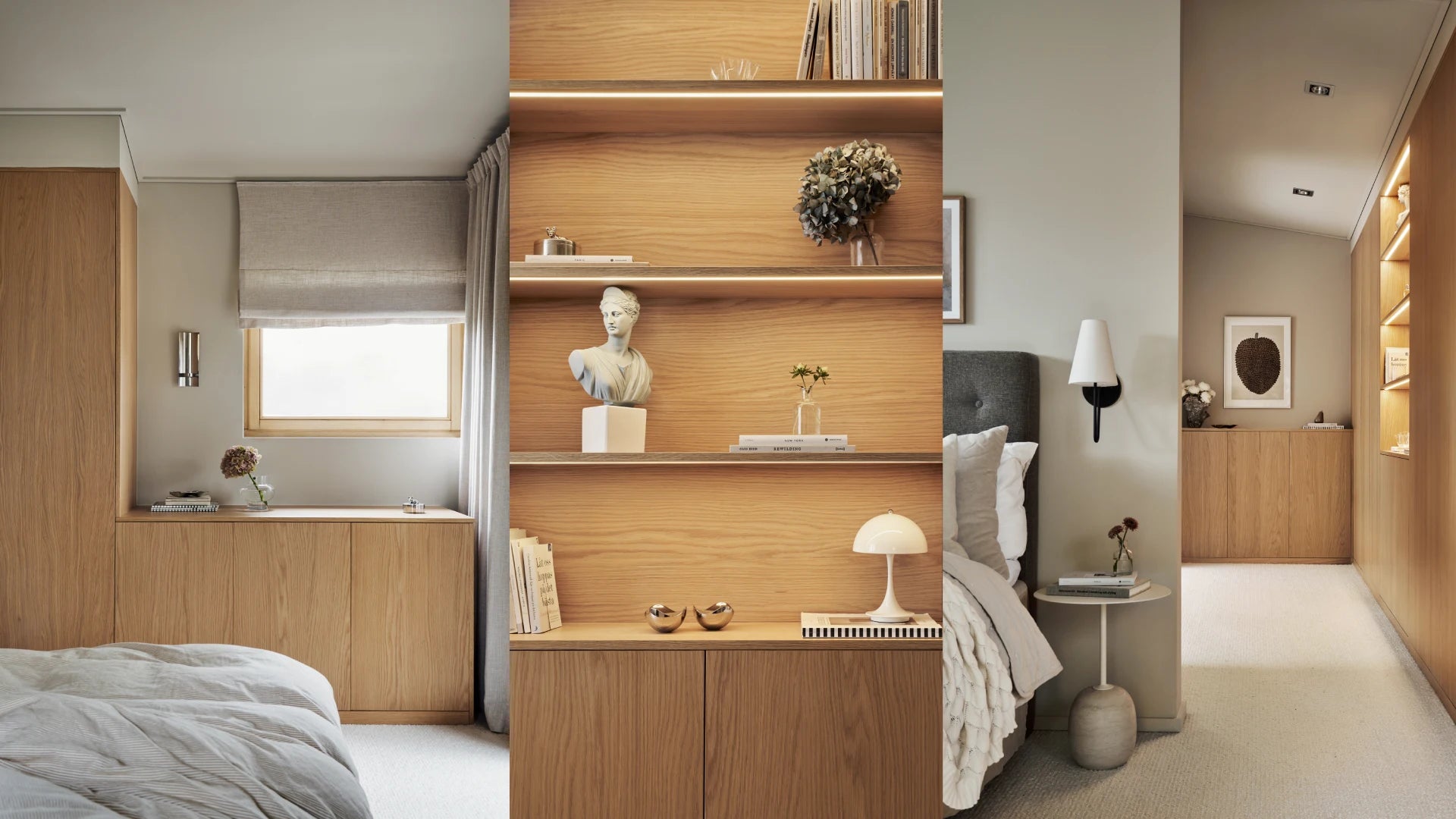 Naturlig ek i ett slätt utförande ger garderoben en varm och harmonisk känsla.